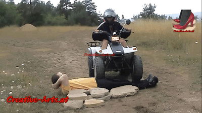 Goddess lent some money to her neighbor and the return date was long overdue. She went over to his place but could not find him. She rode her bike around the neighborhood and fortunately ran into him by the road. When she asked for her money he told her that he had gambled off all of it and had nothing to give her. He even went ahead to insult her and decided to humiliate him. She drove her bike over him, especially over his legs and his body while everyone watched.
